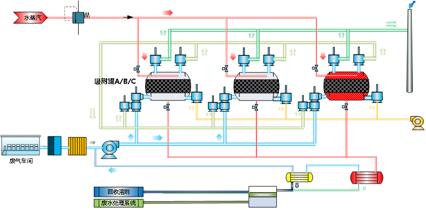 原理:将污染物富集到吸附材料上,然后通过热空气、氮气水蒸气脱附,脱附后的介质利用冷凝工艺,实现有用物质的回收。